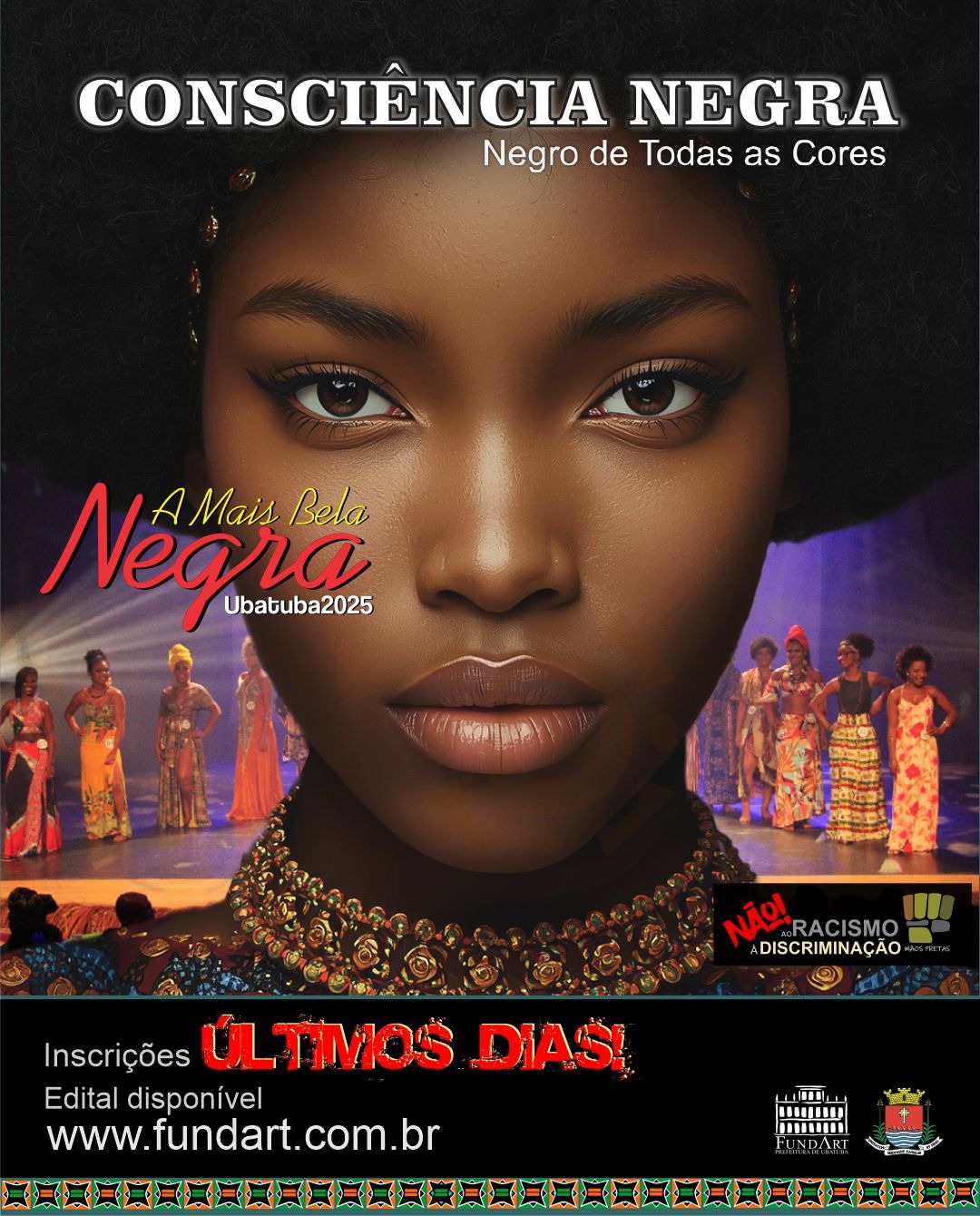 O concurso “A Mais Bela Negra 2025”, promovido pela Fundação de Arte e Cultura de Ubatuba (Fundart), está na reta final de inscrições. As interessadas em participar da iniciativa, que faz parte do tradicional evento “Negro de Todas as Cores”, que completa 18 anos nesta edição, devem se inscrever até o dia 24 de outubro, na sede da Fundação.