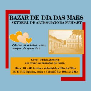 Bazar de Dia das Mães: Grupo Setorial de Artesanato da FundArt Em homenagem ao dia das mães, o Grupo Setorial de Artesanato da FundArt promove nos dias 4 e 5 de maio um bazar na Praça Anchieta, Centro - em frente ao Sobradão do Porto. O bazar continua de 10 a 12 de maio, no...