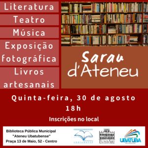 No próximo dia 30 de agosto, quinta-feira, a Biblioteca Pública Municipal “Ateneu Ubatubense” organiza o Sarau d’Ateneu: um espaço aberto para escritores, atores, músicos e artistas plásticos expressarem seus talentos.