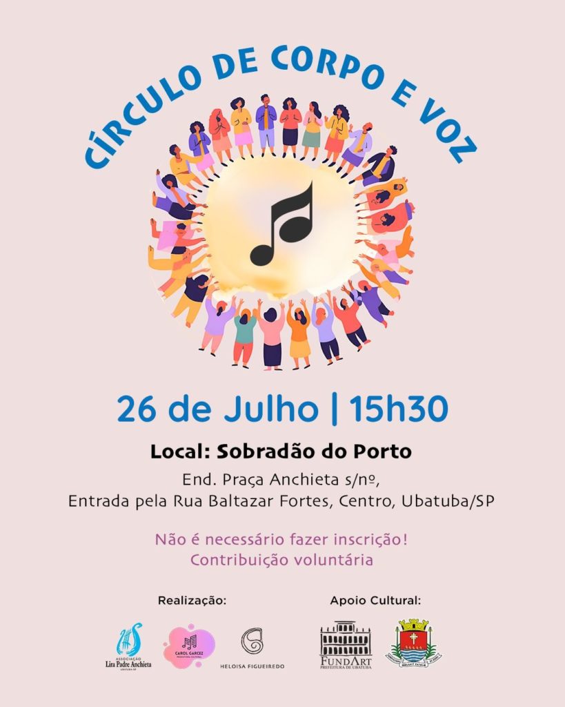 O encontro é realizado pela Associação Lira Padre Anchieta, pela produtora Carol Garcez e pela musicista Heloisa Figueiredo, que conduzirá a ação, e conta com apoio da Fundação de Arte e Cultura de Ubatuba – Fundart.
