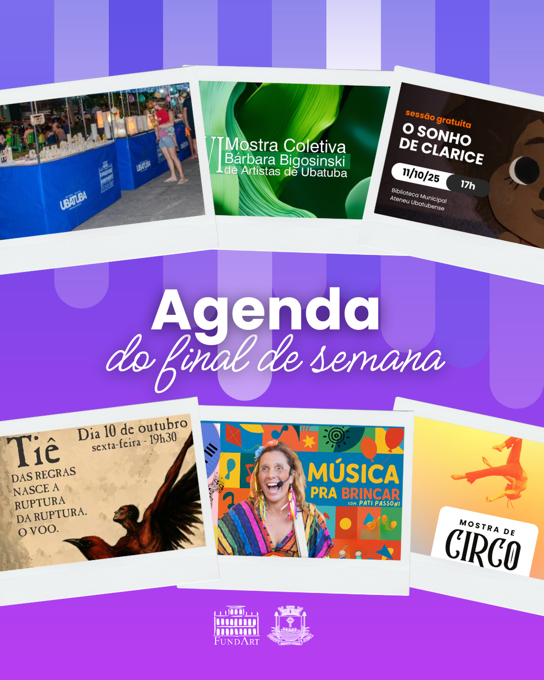 A programação começará nesta sexta-feira com o espetáculo “Tiê – Das regras nasce a ruptura, da ruptura o voo”, do Corpo de Baile de Caraguatatuba, no Teatro Municipal. Já no sábado, a Praça Nóbrega receberá a Feirinha do Setorial de Artesanato da Fundação de Arte e Cultura de Ubatuba (Fundart) e a V Mostra de Saberes Artesanais, enquanto o Teatro Municipal apresentará a Mostra de Circo do Ponto de Cultura Convívio das Artes e a Biblioteca Municipal exibirá o filme “O Sonho de Clarice” – parceria entre o Programa Pontos MIS e a Fundart. No domingo, o espetáculo “Música pra Brincar” encerrará o fim de semana com uma apresentação dedicada às crianças.
