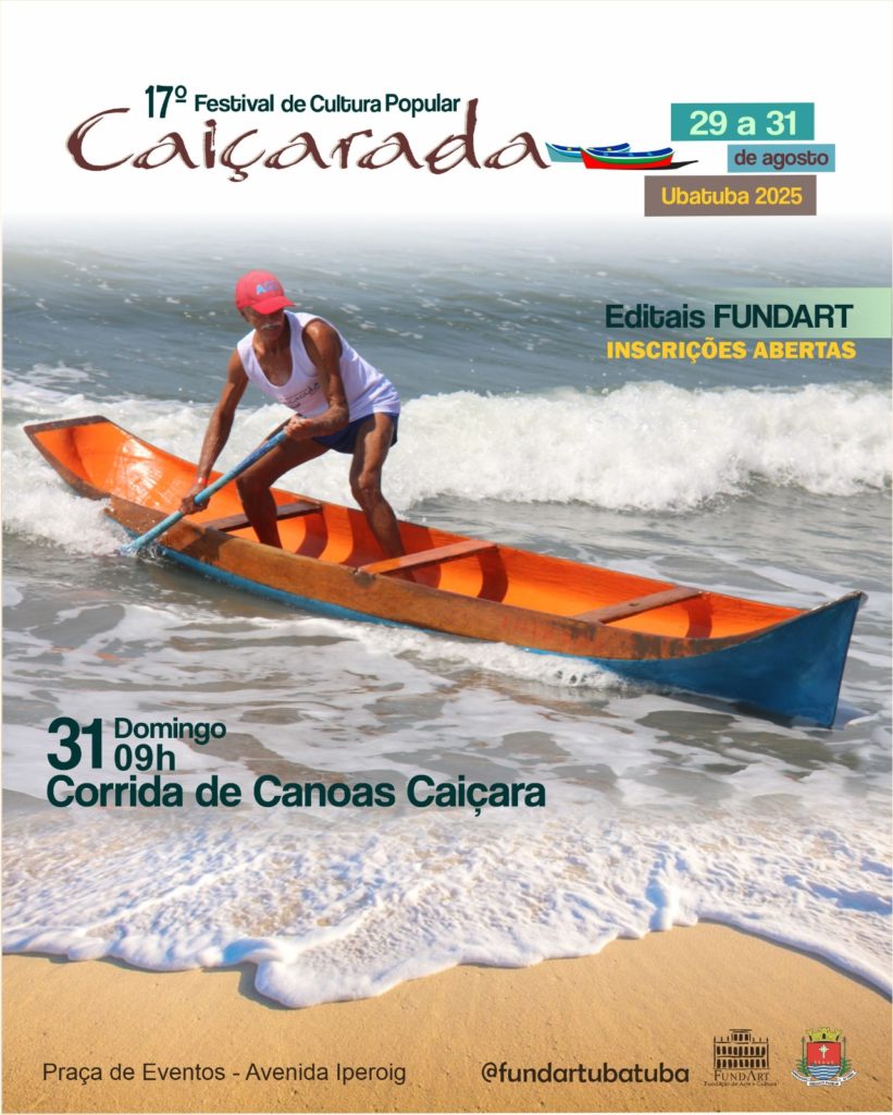 A Fundação de Arte e Cultura de Ubatuba (Fundart) abriu as inscrições para a Corrida de Canoas do 17º Festival de Cultura Popular – Caiçarada, que será realizada no dia 31 de agosto (domingo), a partir das 9h, na Praia do Cruzeiro, em Ubatuba, com participação gratuita para todos os interessados.