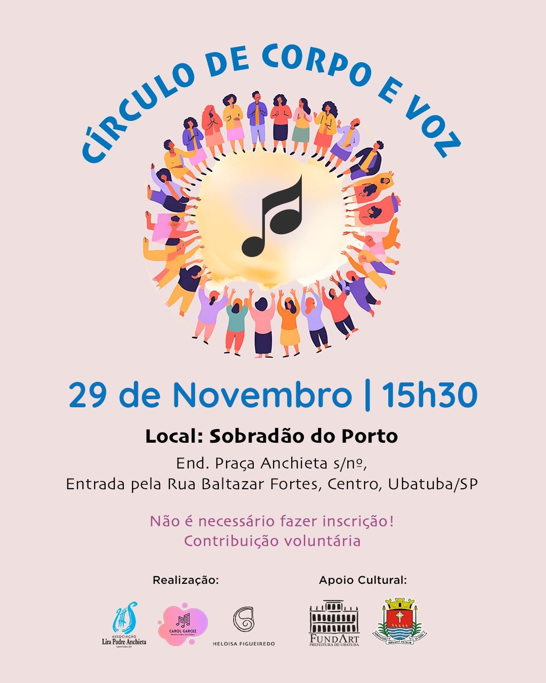 No dia 29 de novembro, às 15h30, moradores de Ubatuba interessados em integrar uma prática coletiva de criação musical em grupo, utilizando o próprio corpo como instrumento, poderão comparecer ao Anexo do Sobradão do Porto e participar da última edição de 2025 do “Círculo de Corpo e Voz”.
