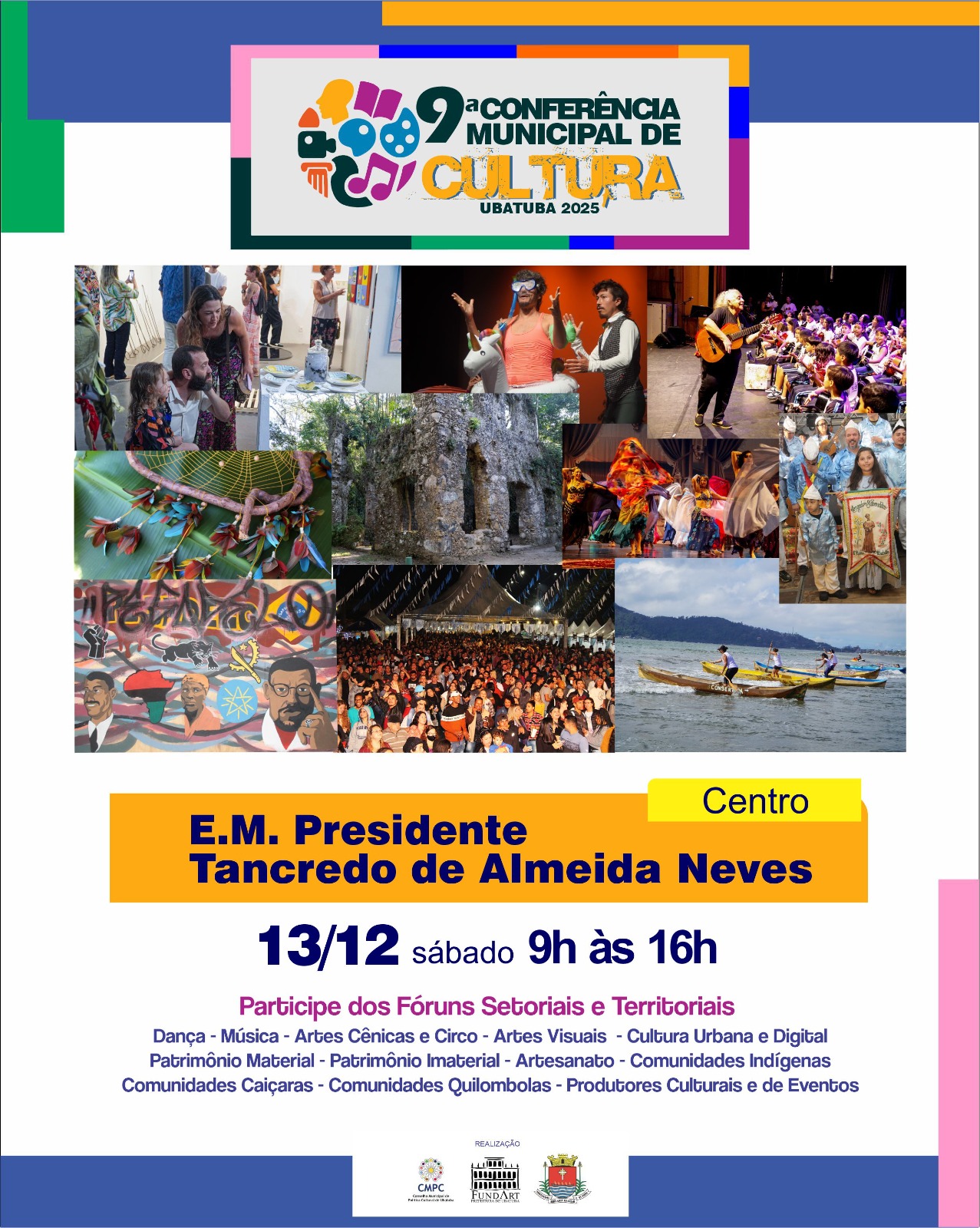 A Fundação de Arte e Cultura de Ubatuba (Fundart) convida moradores de todas as regiões da cidade para participar, neste sábado, 13 de dezembro, de um encontro que definirá as diretrizes culturais para os próximos anos. Trata-se da 9ª Conferência Municipal de Cultura, que ocorrerá das 9h às 16h, na Escola Municipal Presidente Tancredo. A atividade será aberta ao público, com inscrições prévias disponíveis on-line (https://forms.gle/SQTomQC9KRduGqCa8) e também efetuadas presencialmente no dia.