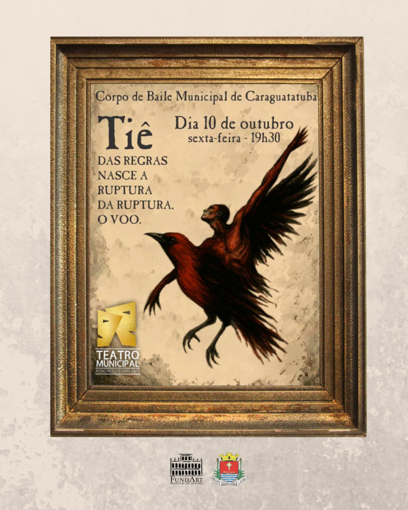 O Corpo de Baile de Caraguatatuba levará ao palco do Teatro Municipal Pedro Paulo Teixeira Pinto, em Ubatuba, o espetáculo “Tiê – Das regras nasce a ruptura, da ruptura o voo”, no dia 10 de outubro, às 19h30. A apresentação tem duração de 40 minutos, classificação livre e entrada social mediante a doação de 1 kg de alimento não perecível.