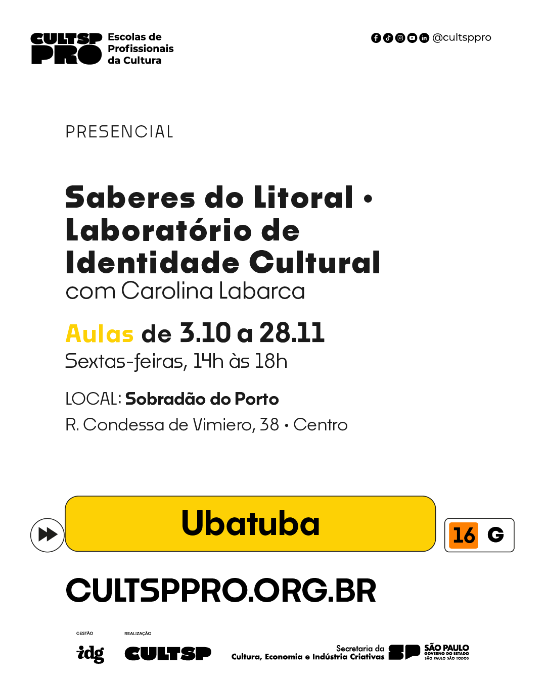 Estão abertas as inscrições para o curso Saberes do Litoral – Laboratório de Identidade Cultural, oferecido pela Secretaria da Cultura, Economia e Indústria Criativas do Estado de São Paulo, por meio da CultSP Pro, com apoio da Fundação de Arte e Cultura de Ubatuba – Fundart. A formação gratuita soma 36 horas e será realizada de 3 de outubro a 28 de novembro, às sextas-feiras, das 14h às 18h, no Sobradão do Porto.