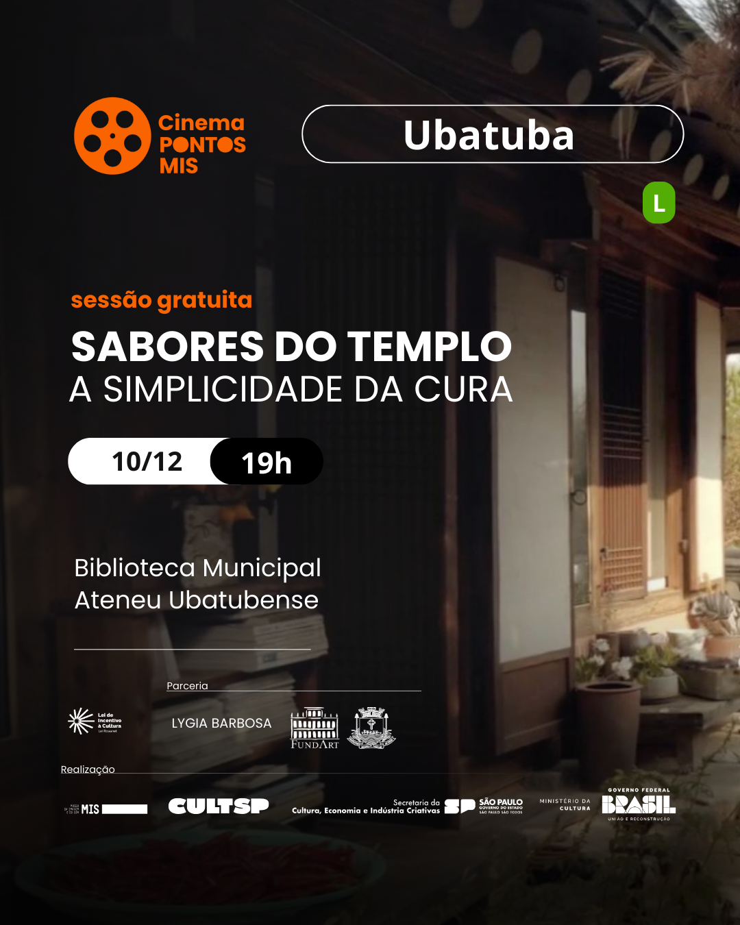 Moradores e turistas de Ubatuba estão convidados para mais uma sessão gratuita de cinema na Biblioteca Municipal Ateneu Ubatubense, localizada na Praça 13 de Maio. Nesta quarta-feira, 10 de dezembro, às 19h, será exibido o filme “Sabores do Templo: A Simplicidade da Cura”, que acompanha o cotidiano de três monjas na Coreia do Sul e mostra como práticas alimentares orientam modos de vida sustentáveis. A sessão integra o Programa Pontos MIS (Museu da Imagem e do Som), do Governo do Estado de São Paulo, realizado em parceria com a Fundação de Arte e Cultura de Ubatuba (Fundart), que leva produções audiovisuais a espaços culturais e forma novos públicos por meio de debates e ações de difusão.