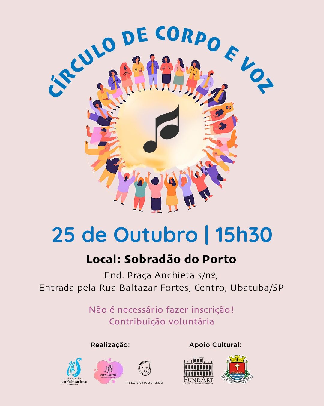 O encontro é uma realização da Associação Lira Padre Anchieta, da produtora Carol Garcez e da musicista Heloisa Figueiredo, responsável pela condução da prática, com apoio da Fundação de Arte e Cultura de Ubatuba – Fundart.