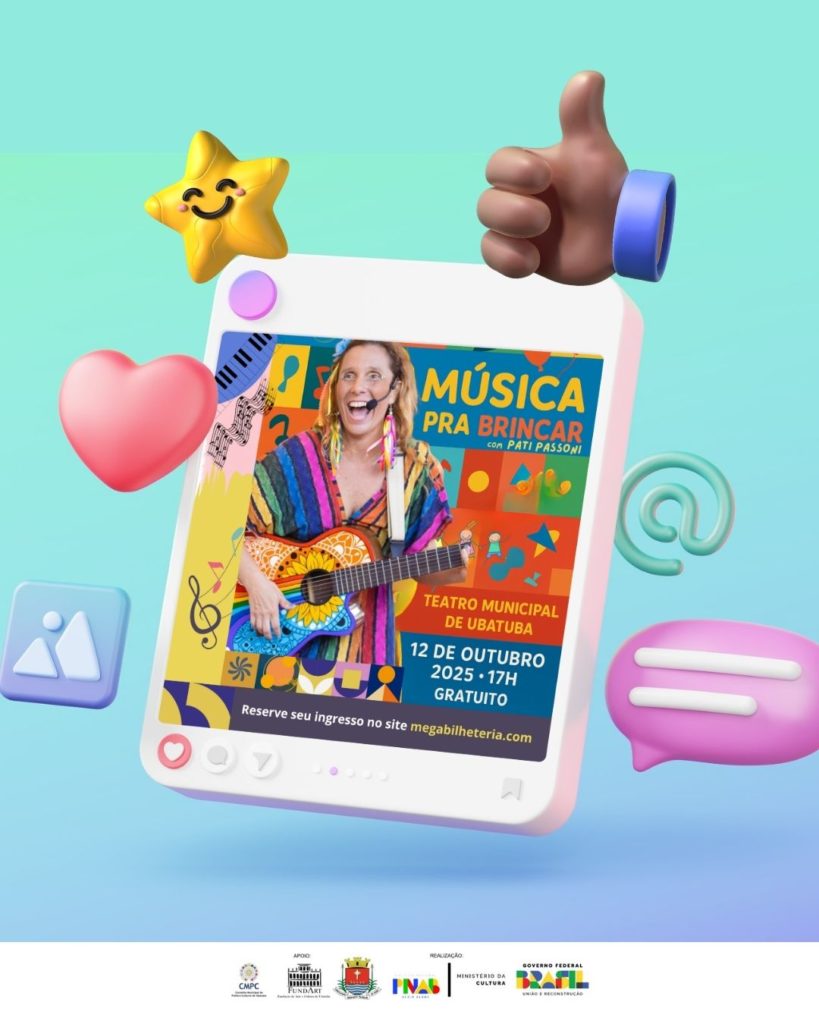 No dia 12 de outubro, data dedicada à infância no Brasil, o Teatro Municipal Pedro Paulo Teixeira Pinto abrirá suas portas para a apresentação gratuita “Música pra Brincar”, viabilizada com recursos da Política Nacional Aldir Blanc (PNAB), por meio da Fundação de Arte e Cultura de Ubatuba (Fundart).