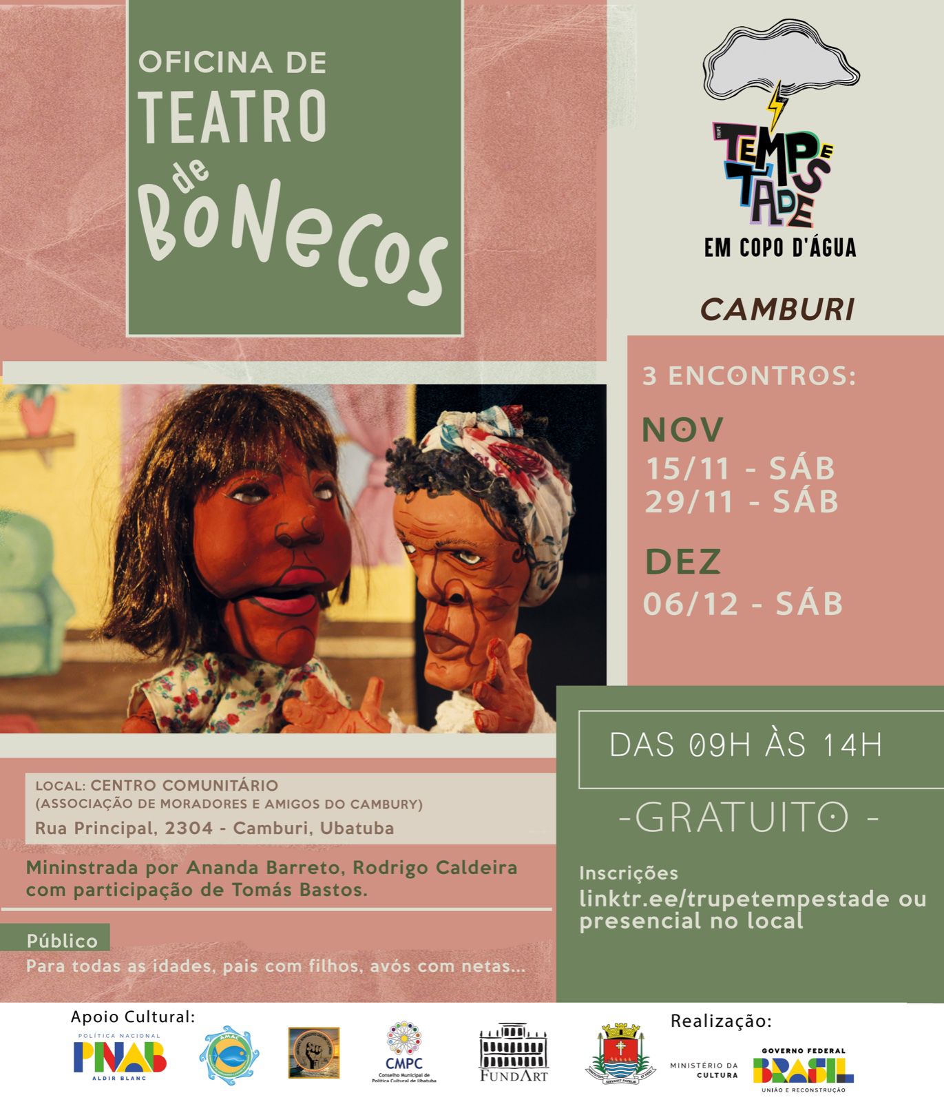Moradores do Camburi poderão participar, a partir deste sábado (15), de uma oficina de teatro de bonecos promovida pela Trupe Tempestade em Copo D’Água. Serão três encontros presenciais no Centro Comunitário (Associação de Moradores e Amigos do Cambury), nos dias 15/11, 29/11 e 6/12, das 9h às 14h.
