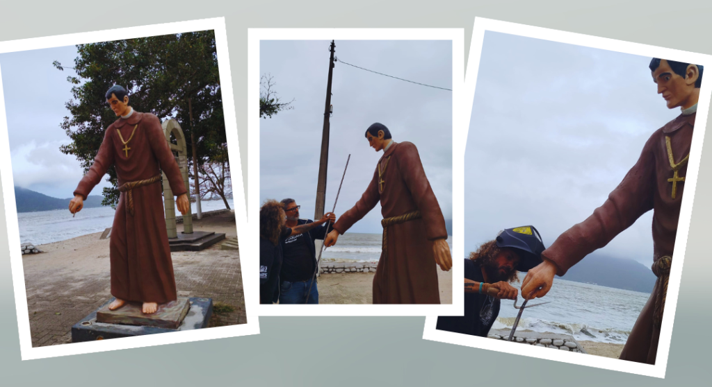 Nesta segunda-feira, 8 de setembro, a estátua de Padre José de Anchieta retornou à orla da Avenida Iperoig, na região central de Ubatuba. O monumento havia sido vandalizado — com a remoção do braço — e foi revitalizado pela equipe de manutenção da Fundação de Arte e Cultura de Ubatuba (Fundart) e pelo artista plástico Tiano Mendes, com apoio de comerciantes locais.
