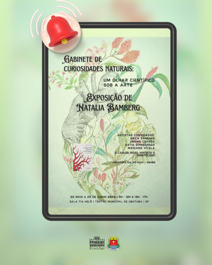 A partir do dia 22 de maio, o Teatro Municipal Pedro Paulo Teixeira Pinto, em Ubatuba (SP), abrirá a sala Tia Helô para a exposição “Gabinete de Curiosidades Naturais: um olhar científico sob a arte”, de Natália Bamberg. A mostra reunirá aquarelas e instalações interativas que exploram a relação entre arte, botânica e entomologia, com visitação gratuita.