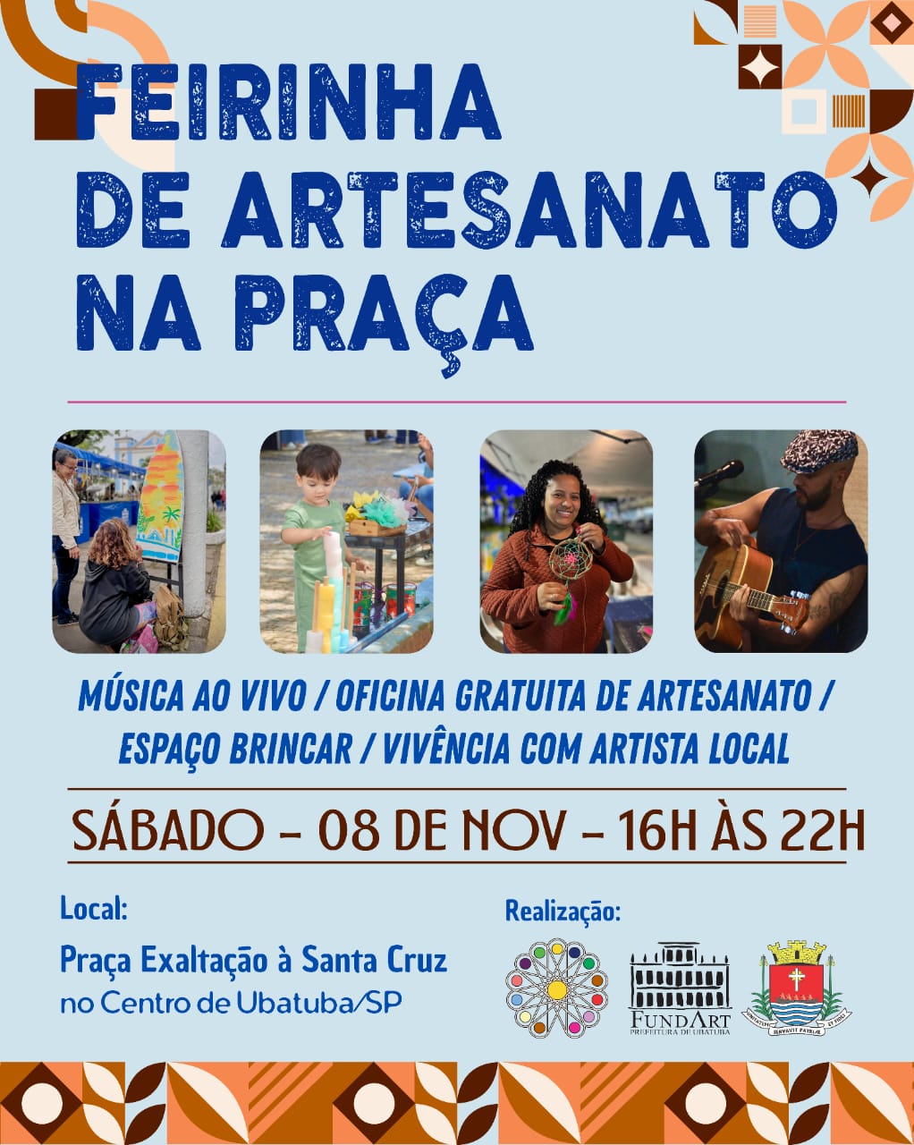 Peças feitas à mão ocuparão a Praça da Matriz neste sábado, 8 de novembro, das 16h às 22h, em mais uma edição da Feirinha do Setorial de Artesanato da Fundação de Arte e Cultura de Ubatuba (Fundart). O encontro reunirá produtores locais em um espaço aberto à troca de saberes, experimentação e apresentações culturais.