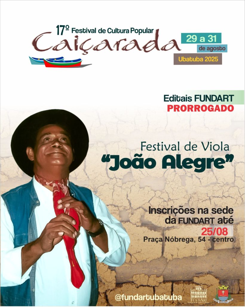A Fundação de Arte e Cultura de Ubatuba (Fundart) estendeu até o dia 25 de agosto, às 16h, o prazo para inscrições no Festival de Viola “João Alegre”, que integra a programação do 17º Festival de Cultura Popular – Caiçarada, marcado para o último fim de semana do mês na Praça de Eventos. O concurso foi aberto em 25 de julho com inscrições previstas para se encerrar no dia 18, prazo agora ampliado.