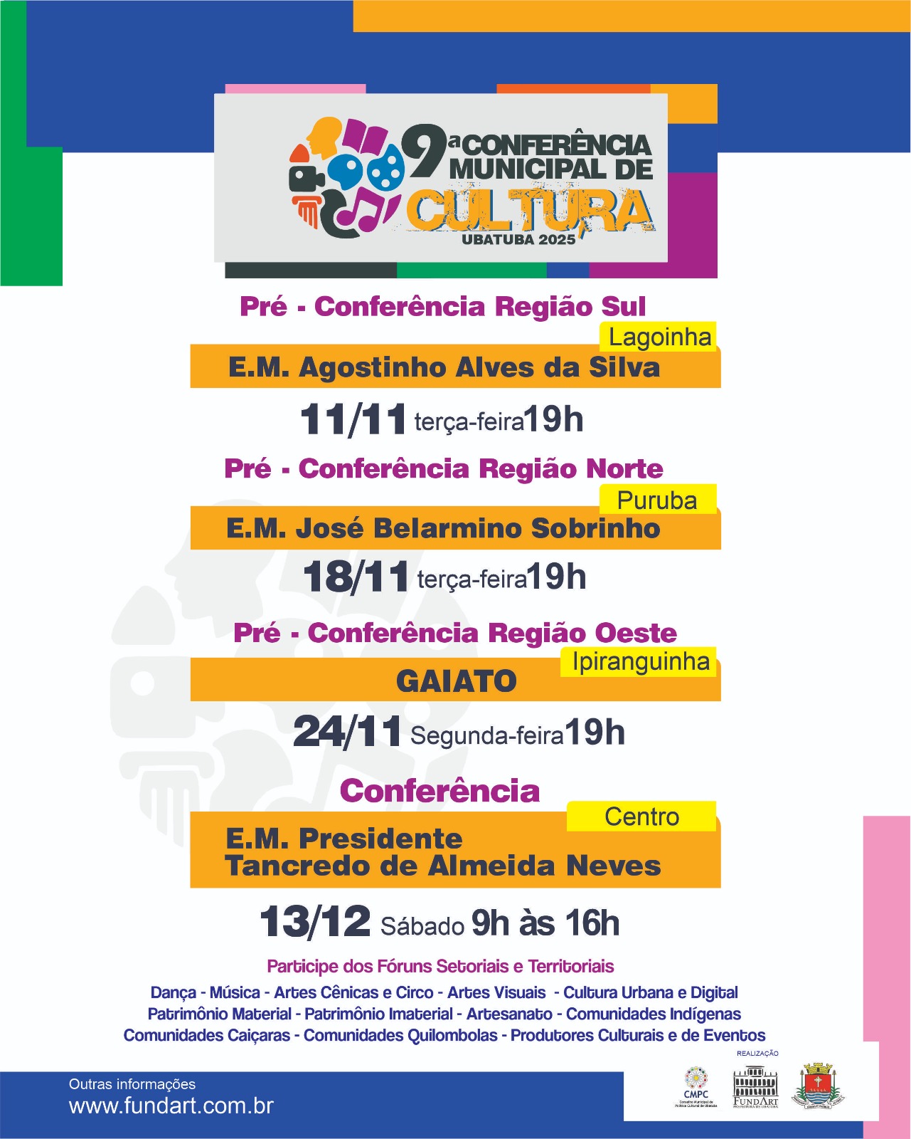 A Fundação de Arte e Cultura de Ubatuba (Fundart) convida a população a participar das Pré-Conferências Setoriais e Territoriais e da 9ª Conferência Municipal de Cultura, que serão realizadas entre novembro e dezembro. Os encontros discutirão o futuro das políticas culturais do município e elegerão novos representantes para o Conselho Municipal de Política Cultural (CMPC).