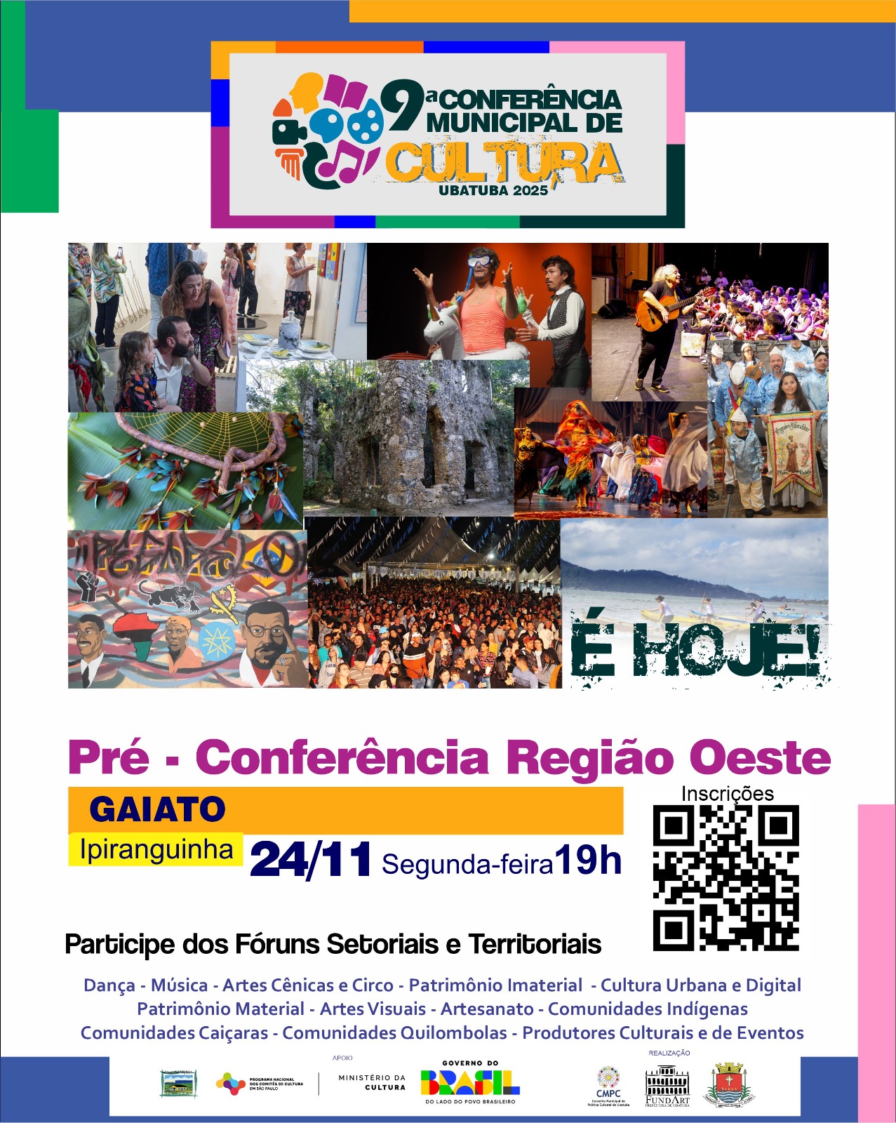 A preparação para a 9ª Conferência Municipal de Cultura segue a todo vapor em Ubatuba. Nesta segunda-feira, 24 de novembro, a população das regiões oeste e centro está convidada a participar da terceira Pré-Conferência, que acontecerá às 19h, na sede do Gaiato.