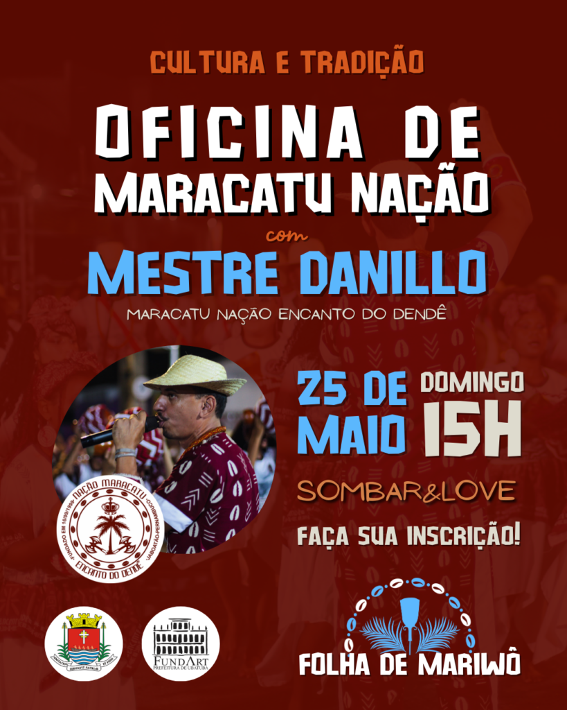 A oficina será conduzida por Danillo Mendes, Mestre da Nação Encanto do Dendê, e acontecerá das 15h às 17h30, na Rua Condessa Vimeiro, 28. Para participar os interessados precisam se inscrever pelo link: formulário de inscrição. É recomendado levar instrumentos e na ocasião, haverá também recreação para crianças a partir de três anos.