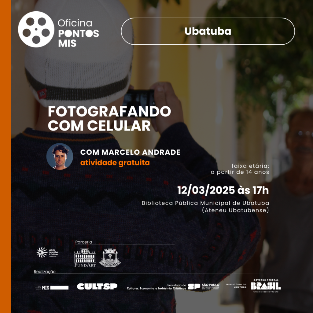Por meio de uma parceria entre a Fundação de Arte e Cultura (Fundart) e o programa estadual Pontos MIS, do Museu da Imagem e do Som, Ubatuba receberá a oficina “Fotografando com celular”, ministrada pelo publicitário Marcelo Andrade. A atividade, destinada para maiores de 14 anos, será gratuita e acontecerá no dia 12 de março, às 17h, na Biblioteca Municipal Ateneu Ubatubense. As inscrições para participar já podem ser feitas pelo e-mail eventos@fundart.com.br, com envio do nome completo e RG.