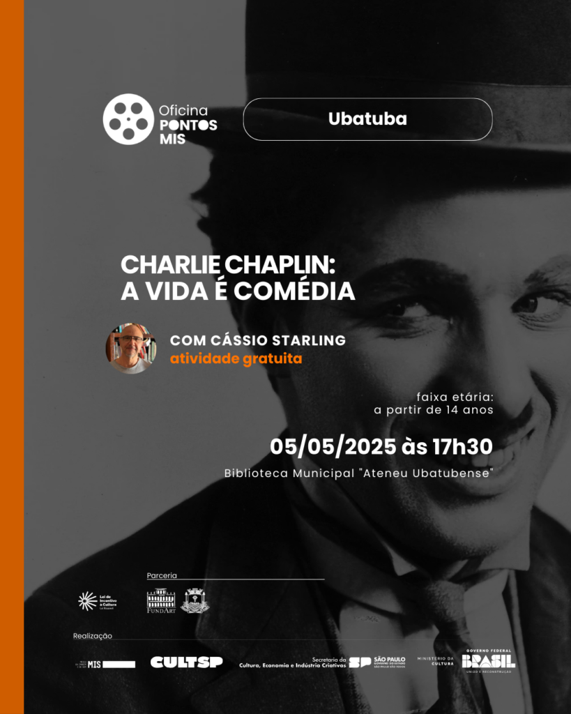 Destinada ao público a partir de 14 anos, a atividade tem duração de três horas e faz parte do programa Pontos MIS (Museu da Imagem e do Som), desenvolvido em parceria com a Fundação de Arte e Cultura de Ubatuba – Fundart. O encontro abordará momentos marcantes da trajetória de Chaplin e promoverá reflexões sobre diferentes interpretações de sua produção cinematográfica.