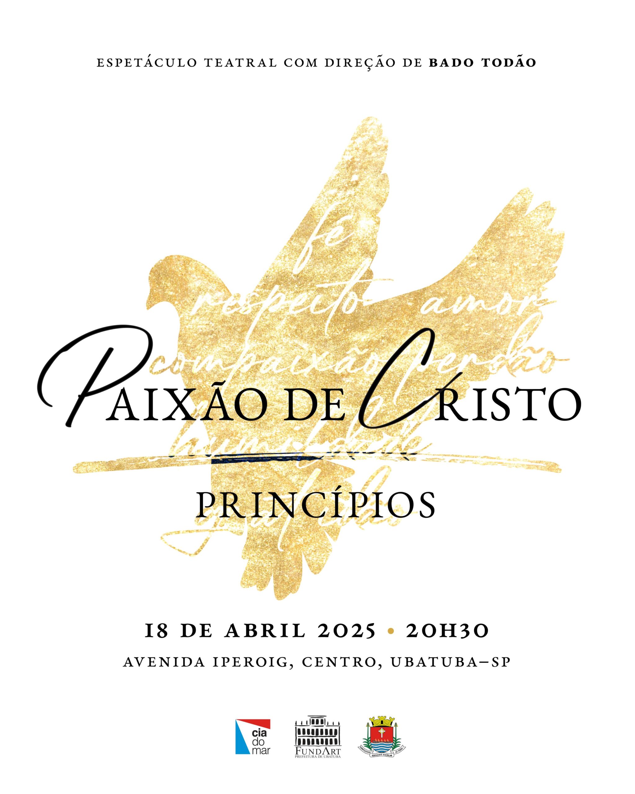 Intitulada “Paixão de Cristo – Princípios”, a apresentação será guiada por sete valores essenciais: Amor, Compaixão, Perdão, Humildade, Respeito, Gratidão e Fé — pilares que nortearão a construção do espetáculo, que reunirá atores profissionais e figurantes voluntários. “O cenário, formado por sete palcos dispostos em semicírculo, foi inspirado em antigos teatros e proporcionará maior proximidade entre artistas e espectadores. Além disso, a Praça de Eventos contará com arquibancadas”, explicou a equipe de produção da Cia do Mar Atividades Artísticas, dirigida por Bado Todão. O espetáculo é viabilizado com recursos da Fundação de Arte e Cultura de Ubatuba – Fundart, por meio de Edital de Fomento.