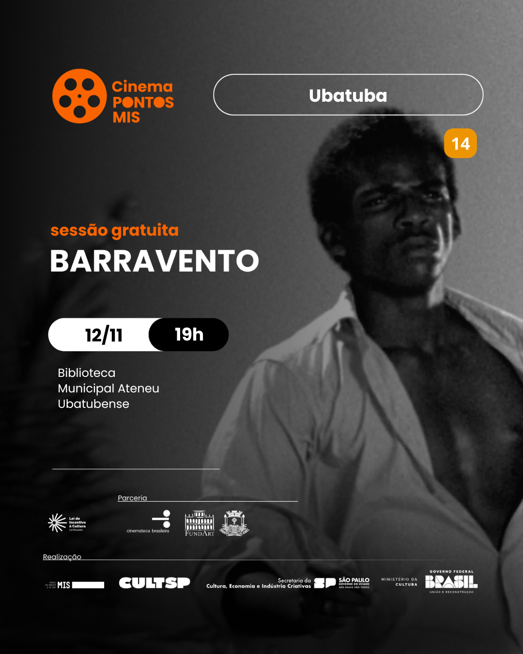 Nesta quarta-feira, 12 de novembro, a Biblioteca Municipal Ateneu Ubatubense receberá mais uma sessão de cinema, com a exibição do filme “Barravento”, às 19h. A atividade integra o Programa Pontos MIS – Museu da Imagem e do Som, do Governo do Estado de São Paulo, realizado em parceria com a Fundação de Arte e Cultura de Ubatuba (Fundart), para ampliar o acesso da população às produções audiovisuais.