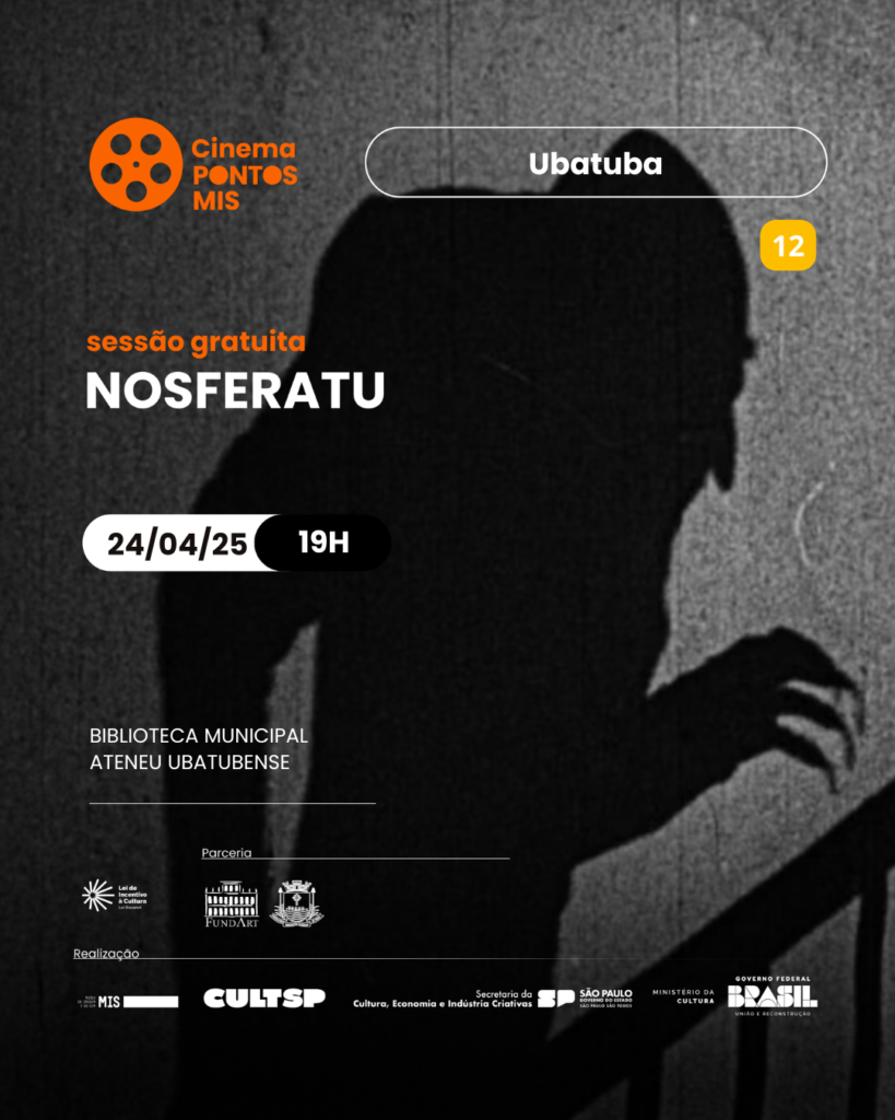 Encerrando a programação de abril do programa Pontos MIS (Museu da Imagem e do Som) em Ubatuba, será exibido nesta quinta-feira, 24, o clássico do cinema “Nosferatu”, na Biblioteca Municipal Ateneu Ubatubense. A sessão começará às 19h, com entrada gratuita e classificação indicativa de 12 anos.