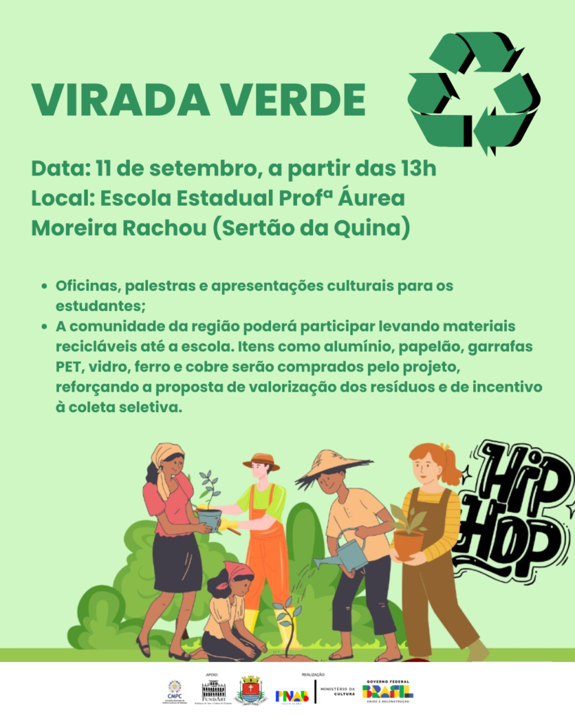 Rimas, conscientização ambiental e conhecimentos medicinais ocuparão o pátio da Escola Estadual Profª Áurea Moreira Rachou nesta quinta-feira, 11 de setembro, das 13h às 17h, durante a “Virada Verde”, atividade promovida por um projeto viabilizado com recursos da Política Nacional Aldir Blanc (PNAB), por meio da Fundação de Arte e Cultura de Ubatuba (Fundart).
