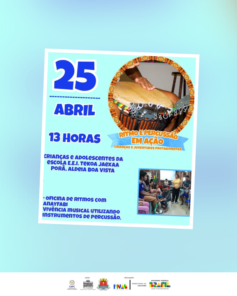 Durante a atividade, conduzida por AnayFabi, serão explorados diferentes ritmos por meio da percussão. A proposta envolve uma vivência musical com a participação de crianças e jovens da comunidade e contará com tradução em Guarani, realizada pelo professor da própria escola, garantindo acessibilidade linguística.