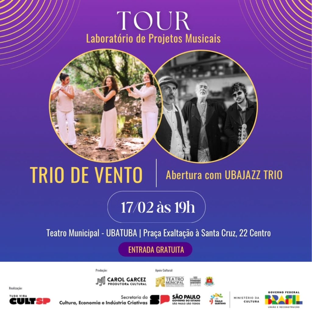 Na segunda-feira, 17 de fevereiro, também às 19h, o palco será ocupado pelo Ubajazz Trio e pelo Trio de Vento. O Ubajazz Trio trará um repertório instrumental com influências do jazz