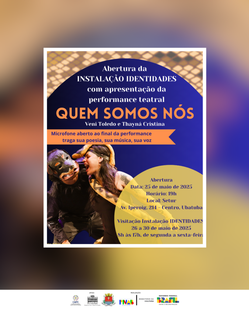 A instalação artística “Identidades” será inaugurada no domingo, 25 de maio, às 19h, na sede da Secretaria de Turismo de Ubatuba (Setur), localizada na Avenida Iperoig, 214, no Centro. Com entrada gratuita, a iniciativa permanecerá aberta ao público entre os dias 26 e 30 de maio, de segunda a sexta-feira, das 8h às 17h.