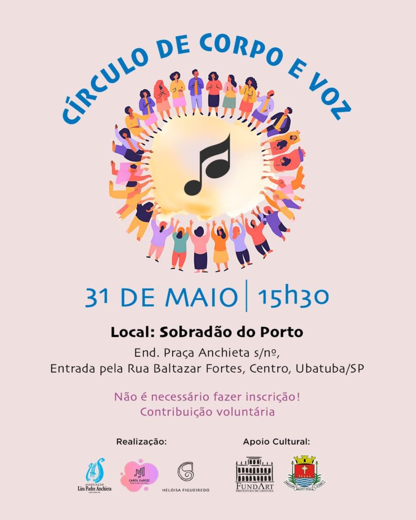 Este será o primeiro de uma série de encontros mensais previstos até novembro. A ação é realizada pela Associação Lira Padre Anchieta, pela produtora Carol Garcez e pela musicista Heloisa Figueiredo, e conta com apoio da Fundação de Arte e Cultura de Ubatuba – Fundart.